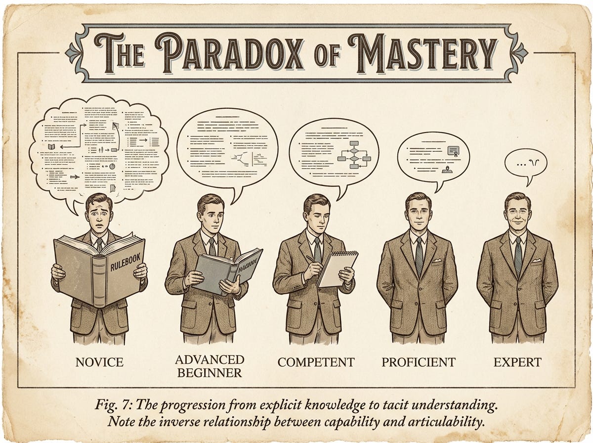 The more skilled you become, the less you can explain what you’re doing because your knowledge compiles into automatic processes that fire without conscious thought.