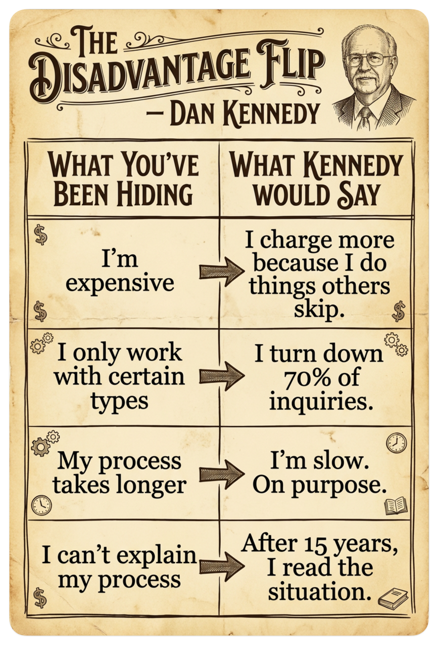 Level 3: The Reframe Kennedy’s move is taking what you’ve been apologizing for and turning it into proof you know what you’re doing. “I’m expensive” becomes “You’re paying for mistakes you won’t make.” “I’m slow” becomes “Fast is how you end up redoing it.”