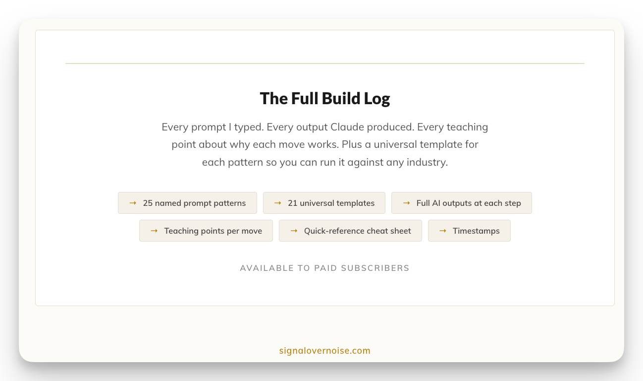 Below are five of them. The full build log has all twenty-five, with universal prompt templates you can run against any industry.
