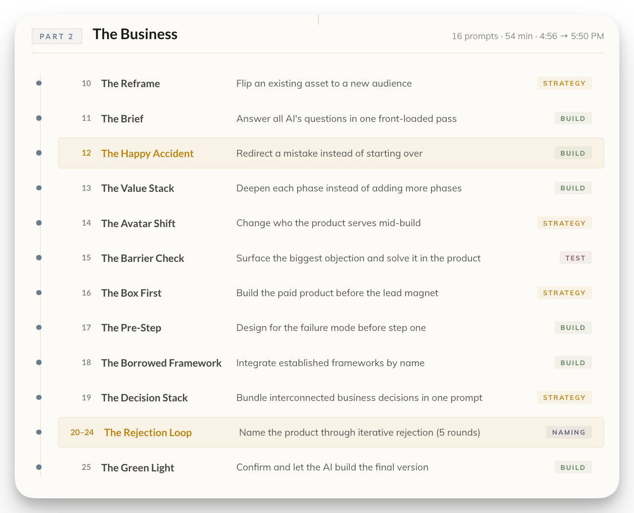 Every prompt is there, in order, with timestamps. But the prompts aren’t the point. Each one maps to a named pattern with a universal template you can copy directly from the page. My prompts were about managed futures. The templates work on anything.