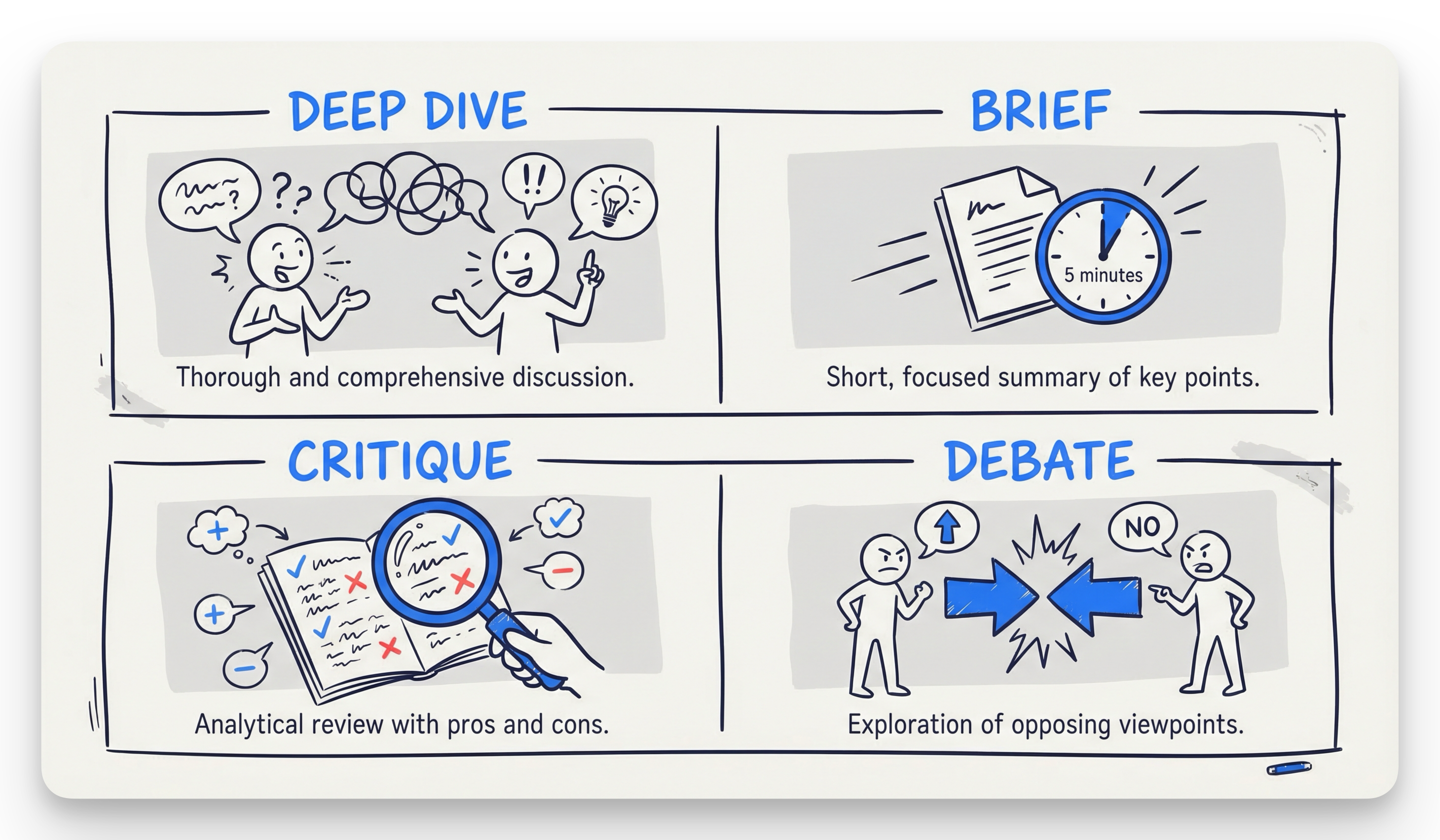 Start with Deep Dive for each book. It’s the most natural way to absorb the material. Use Brief if you’re short on time and want to triage which books matter most. Debate is surprisingly good for books like “Antifragile” where the ideas provoke strong reactions.