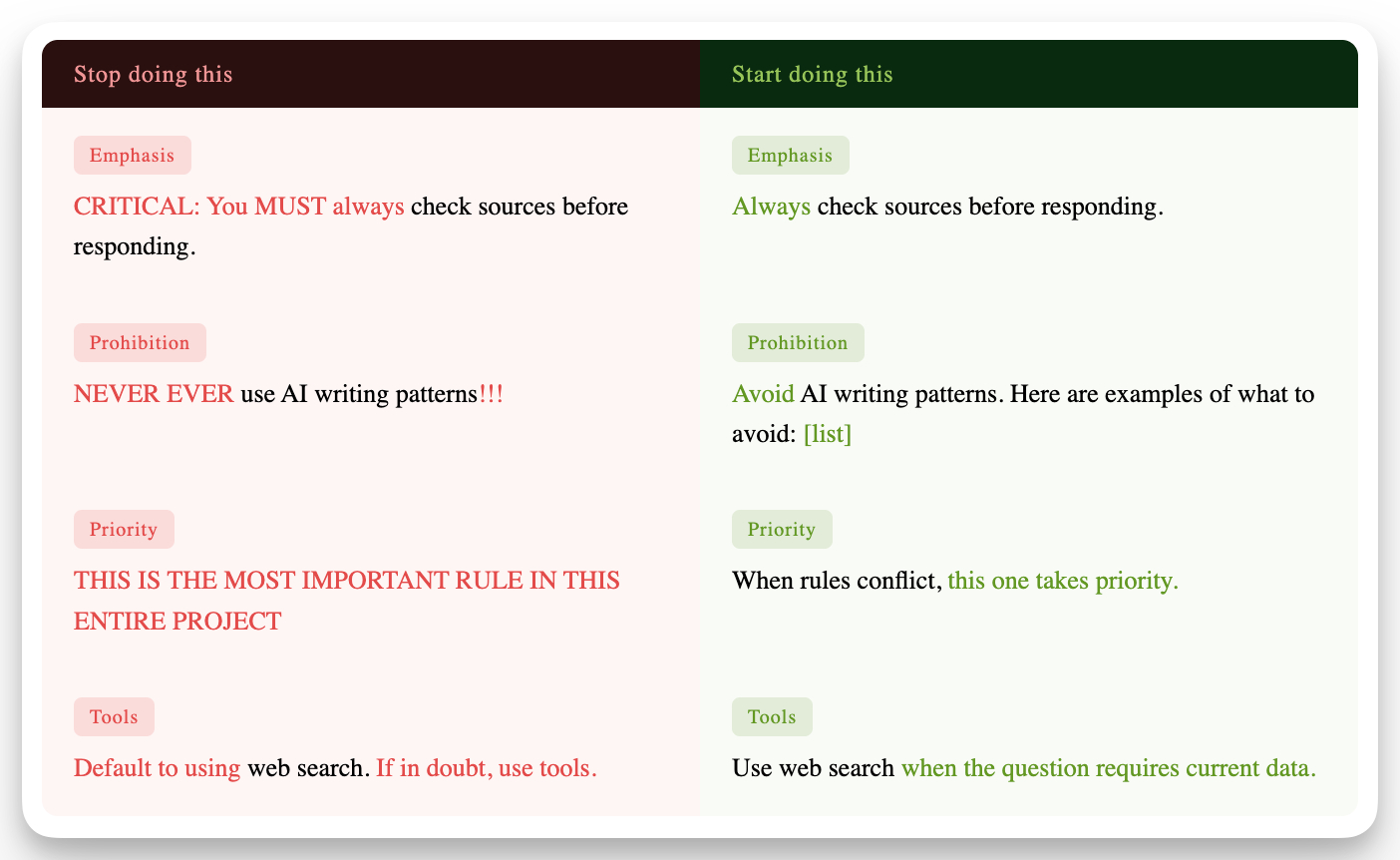 Six months ago, one popular piece of advice was to use emphatic language in your instructions. ALL CAPS for important rules. “YOU MUST always do this.” “CRITICAL: never forget this.” Exclamation marks. Bold. Urgency.