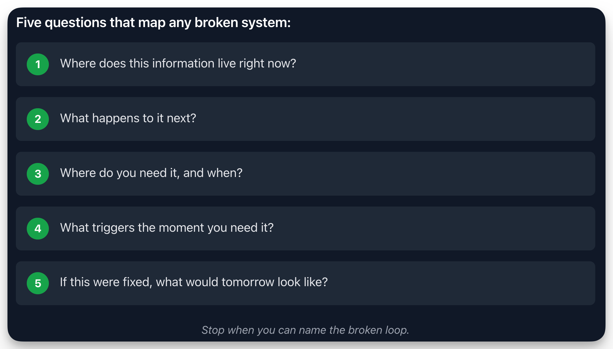This matters because it determines whether you need a push system (information comes to you) or a pull system (you go get it when you remember to).