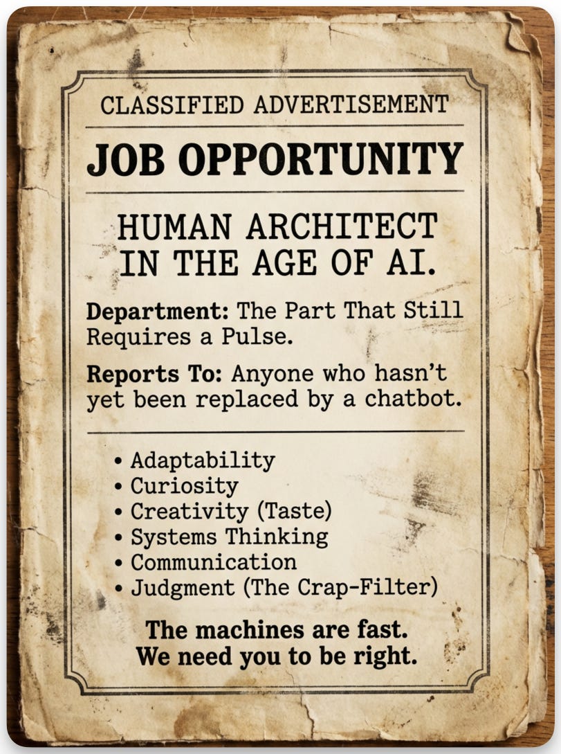 We’re looking for a Human Architect. The title sounds impressive until you realize it’s basically a fancy way of saying “the person who has to sit there and watch a machine do things very quickly and then explain why half of it is wrong.”