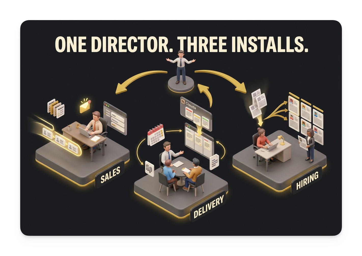 Sarah runs hiring. Her system sorts the resume inbox, scores candidates against a company rubric, and generates a personal profile card on each person for the leadership team to review.